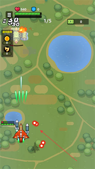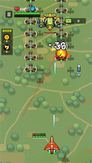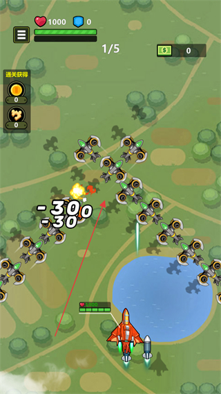 2、操控红色战机移动,主动攻击敌方战机,留意屏幕上显示的伤害数值,如-300-30。