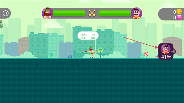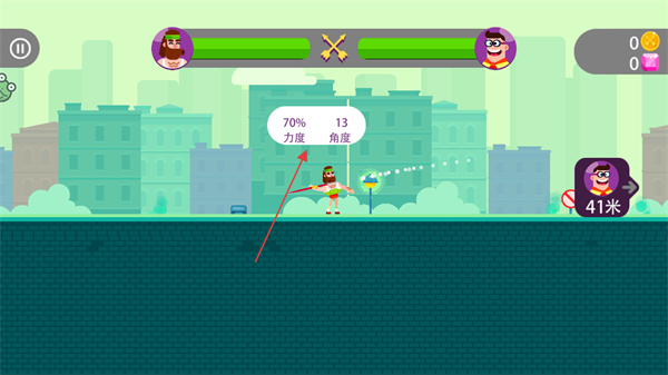2、拉动屏幕中的角色,调整射箭的力度和角度,力度和角度信息会以气泡形式显示,如70%力度,13角度。
