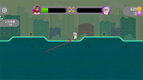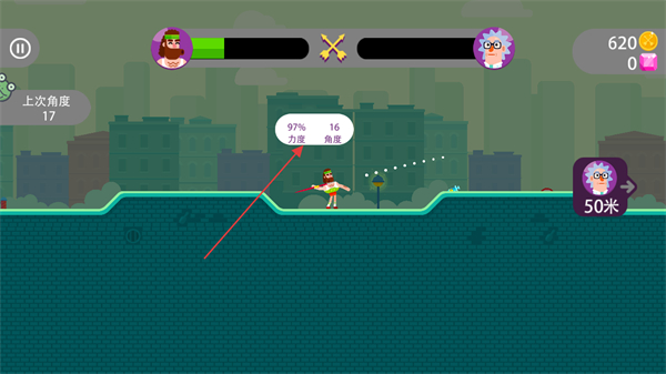 2、拉动角色,调整至97%力度、16角度,瞄准后射出箭矢。