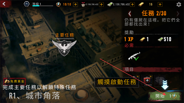 1、查看界面,了解主要任务,点击開始進入任務,注意任务进度任务2/30。