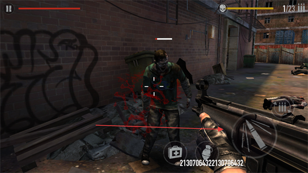 2、進入戰鬥場景,移動視角找到遠處僵尸,瞄準後點擊射擊按鈕進行攻擊。