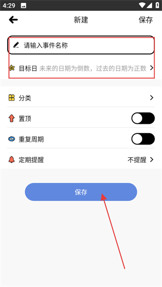 2、在新建页面,输入信息后,点击保存,添加新的纪念日事件。