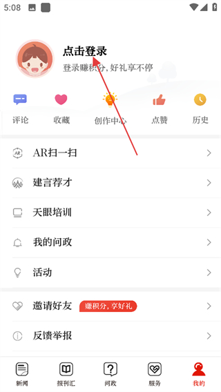 1、进入天眼新闻页面,点击底部我的,进入个人页面。
