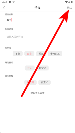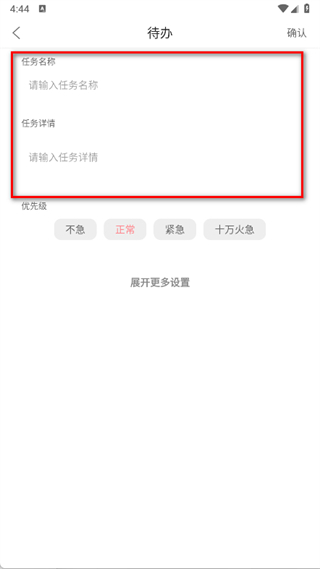 3、填写任务名称、详情,选优先级,展开设开始日期、日历提醒。