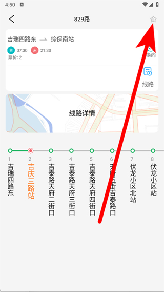 4、进入线路详情页面后,可以清晰查看该线路的各个站点分布、运营时间,点击页面右上角的星形图标,把这条公交线路收藏起来。