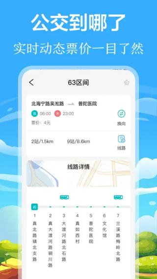 支持“一键查车”自动定位附近线路并区分马路两侧站点,“实时站牌”可查看车辆剩余站数及到站倒计时,“实时地图”直观显示车辆运行轨迹及站点分布。