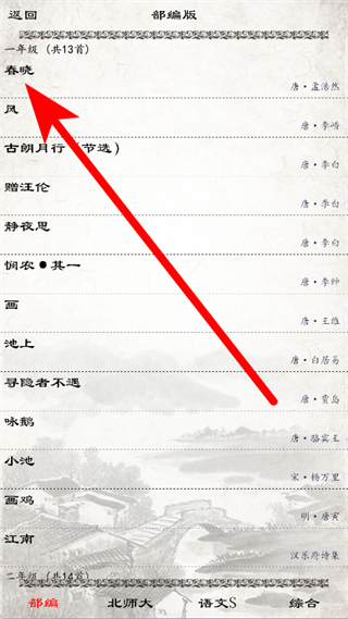 3、在教材列表页,能看到部编版等不同版本、各年级的古诗,想学习的篇目并点击。