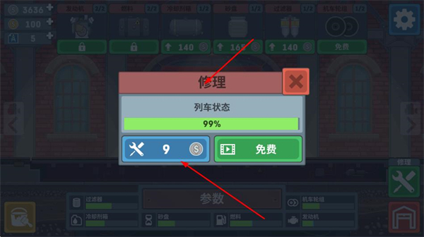 4、还可对列车进行修理,点击修理按钮,可选择花费一定数量的工具或者通过观看广告免费修理,以此保证列车处于良好的运行状态。