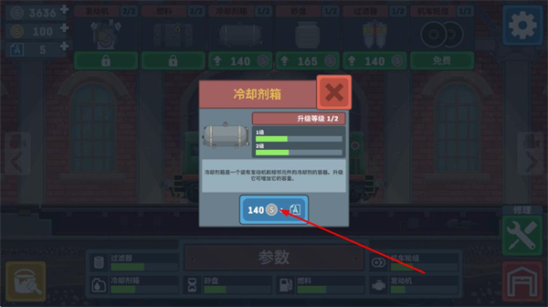 3、点击想要升级的部件,比如冷却剂箱,会弹出该部件的升级界面,显示当前的升级等级和升级所需的费用,支付相应费用后,即可完成对该部件的升级。