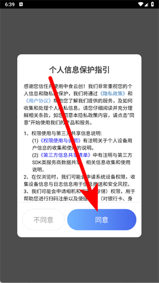 1、打开中食云创,在弹出的弹窗里点击同意。