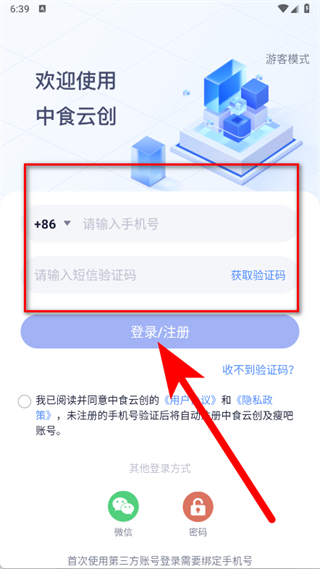 4、输入手机号,获取并输入验证码,点击登录注册,完成注册。
