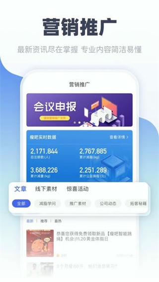 产出减脂科普、创业案例等优质内容,提供多渠道分享工具,帮助创业者吸引目标客户,搭配社交电商功能,实现内容与销售转化结合。