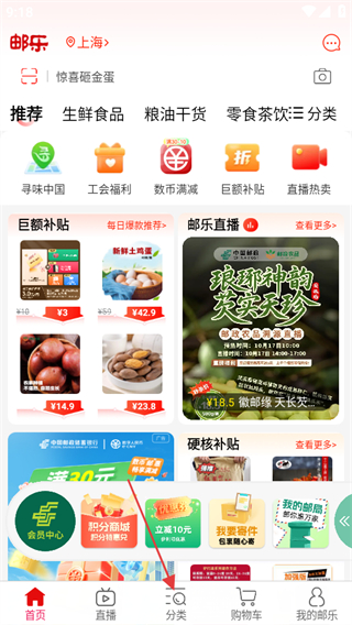 1、进入邮乐网,在首页点击底部分类,进入商品分类页面。