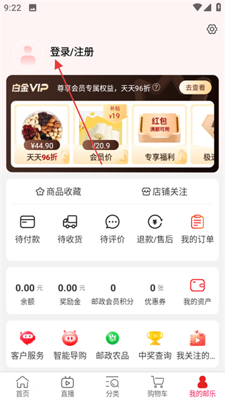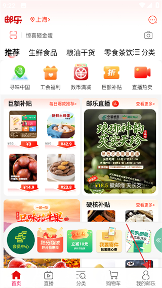 1、进入邮乐网,在首页点击底部我的邮乐,进入个人页面。