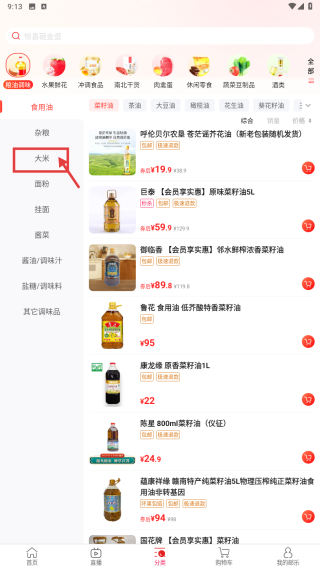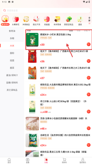 2、在商品分类页面,选择大米分类,浏览大米类商品列表。
