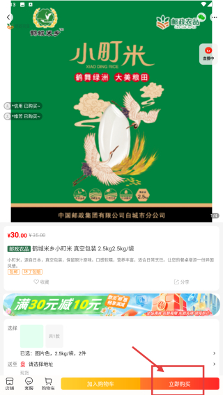 3、在商品列表中,点击目标商品如鹤城米乡小町米真空包装2.5kg,进入商品详情页。