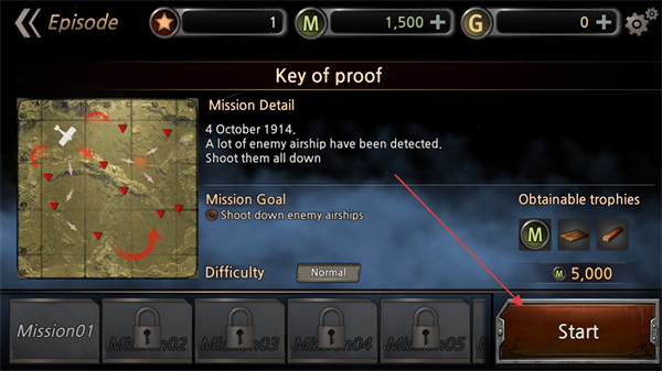 1、在任务界面查看MissionDetail了解任务内容,如1914年10月4日要击落敌军飞艇,点击Start开始任务。