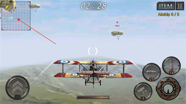 2、进入战斗,通过屏幕左侧小地图观察敌机位置,依据Airship0/5提示明确目标数量。