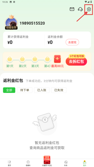 1、打开返利类应用,点击底部我的选项,进入个人中心页面。