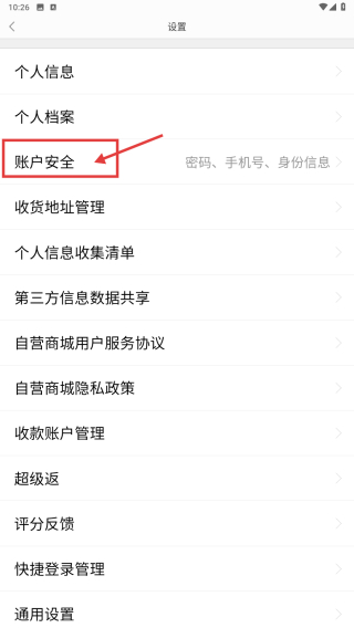 3、在设置界面,点击账户安全选项,查看账户安全相关设置。