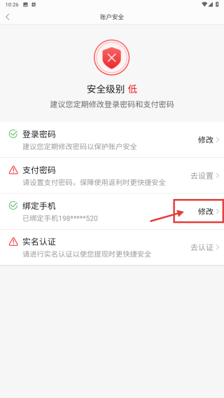 4、在账户安全页面,点击绑定手机后的修改按钮,进行手机号修改操作。