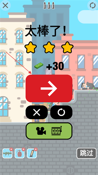 4、成功击败所有敌人后,获得三颗星和+30金钱奖励,点击红色按钮进入下一关。