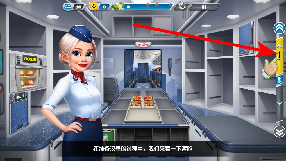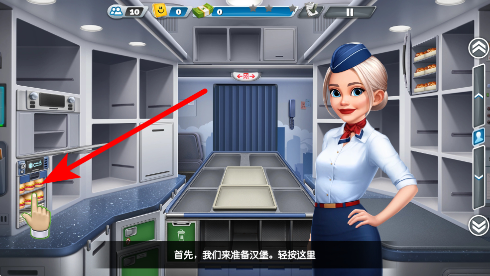 1、进入游戏后,先在机舱厨房区域,根据提示轻按设备准备餐食,比如制作汉堡时,按指定位置操作,启动制作流程,确保餐食制作顺利。