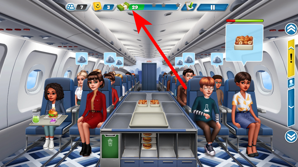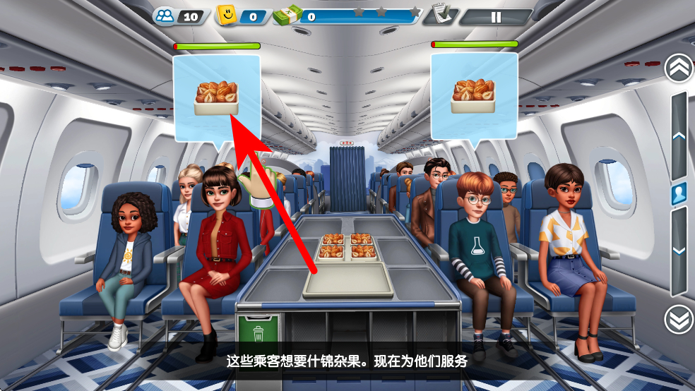 3、餐食制作完成后,将餐食送到客舱,根据乘客订单,把对应的餐食递送给乘客,完成服务后,会获得奖励,奖励可用于升级厨房设备等。