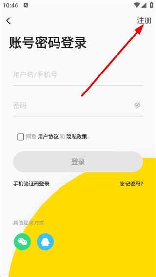 3、在账号密码登录页面,点击右上角注册,进入注册新账号页面。