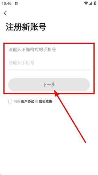 4、在注册新账号页面,输入正确格式的手机号后,点击下一步,继续注册流程。