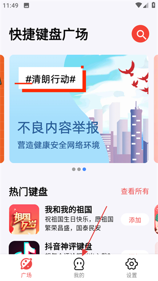 1、在快捷键盘广场页面,点击底部我的,进入个人设置相关页面。