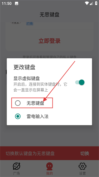 3、在更改键盘选择页面,选择无思键盘,即可完成键盘切换并使用该键盘。