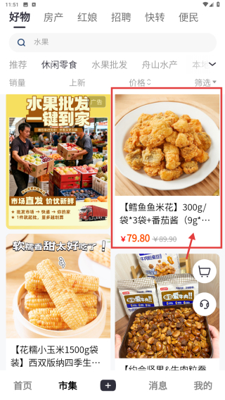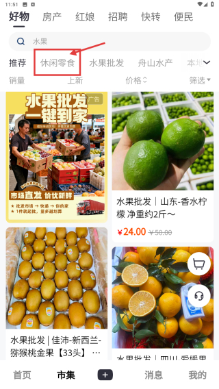2、在市集页面,点击休闲零食分类标签,筛选休闲零食类商品。