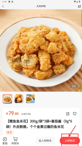 3、在休闲零食商品列表中,找到鳕鱼鱼米花商品,点击进入详情页。