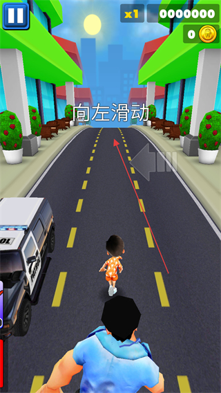 1、进入游戏,根据提示向左滑动屏幕,操控角色在道路上进行移动,躲避前方出现的警车。