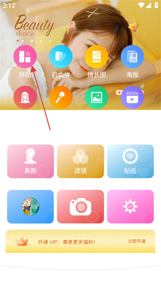 1、进入美颜美妆,在首页点击拼图,进入照片选择页面。