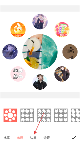 3、在拼图编辑页面,点击布局,挑选喜欢的布局样式后点击边界。