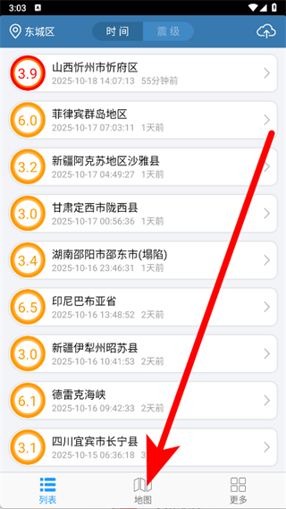 1、打开地震速报,点击页面底部的地图选项,进入地震分布的地图视图页面。