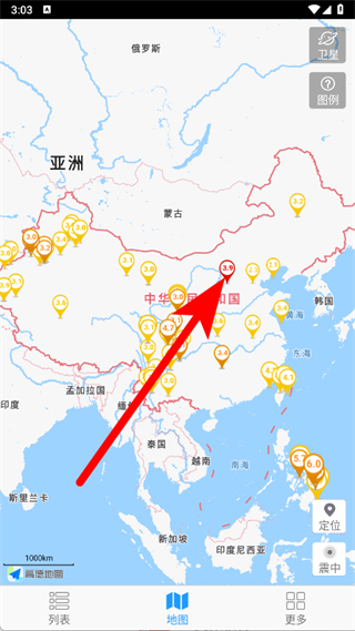 2、在地图视图页面,点击地图上标注的地震点位,进入该地震的详情展示页面。
