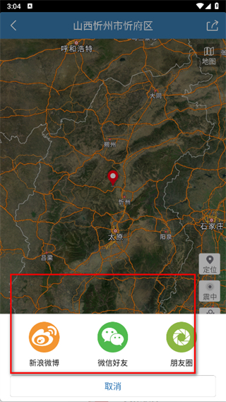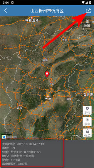 3、进入地震详情页面后,点击页面右上角的分享图标,弹出包含多种分享渠道的选项栏。