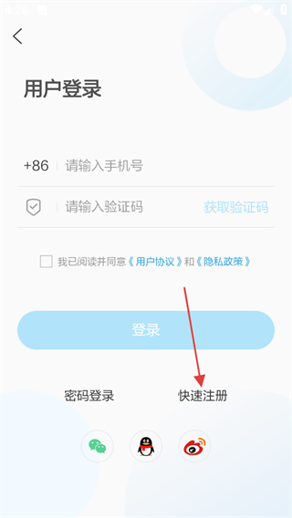3、在用户登录页面,若为新用户,点击快速注册,进入用户注册页面。