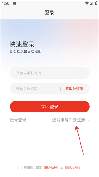 3、在登录页面,若为新用户,点击去注册,进入注册页面。