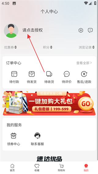 1、进入速达优品,在首页点击底部我的,进入个人中心页面。