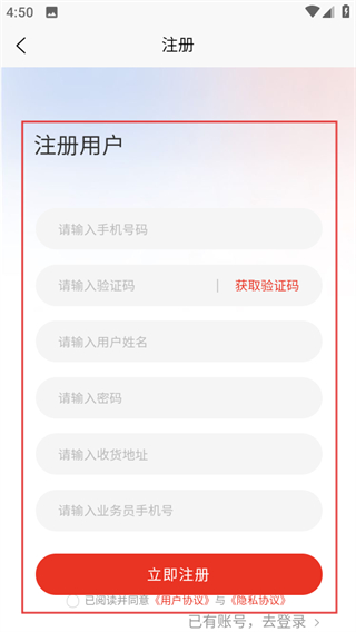 4、在注册页面,依次填写信息,同意协议后,点击立即注册完成注册流程。