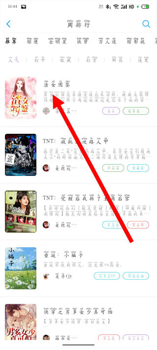 2、进入排行页面,能看到各类榜单及对应的小说作品,挑选一部感兴趣的小说并点击。