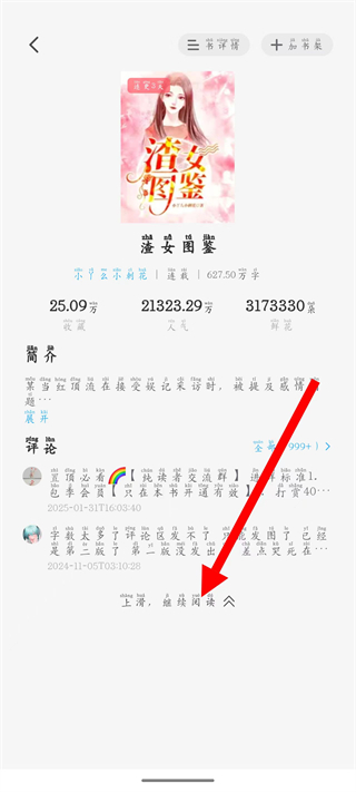 3、进入小说详情页,查看小说简介等信息,点击开始继续阅读按钮,进入小说阅读界面。