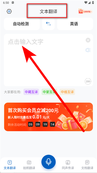 1、打开全球翻译官,在文本翻译页面,点击输入框。