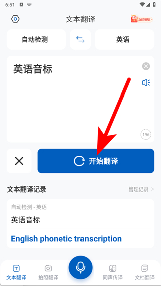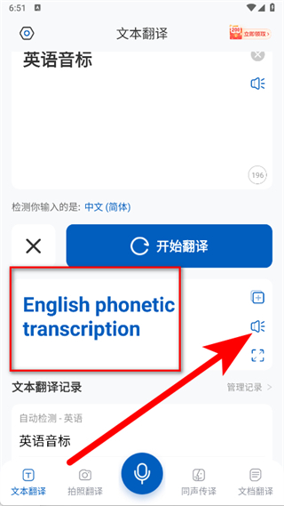 3、翻译完成后,点击翻译结果旁的喇叭图标,播放译文语音。