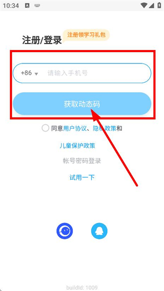 2、在注册/登录页面,输入手机号后,点击获取动态码。