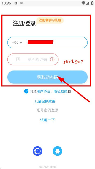 3、在注册/登录页面,输入图片验证码,再次点击获取动态码。
